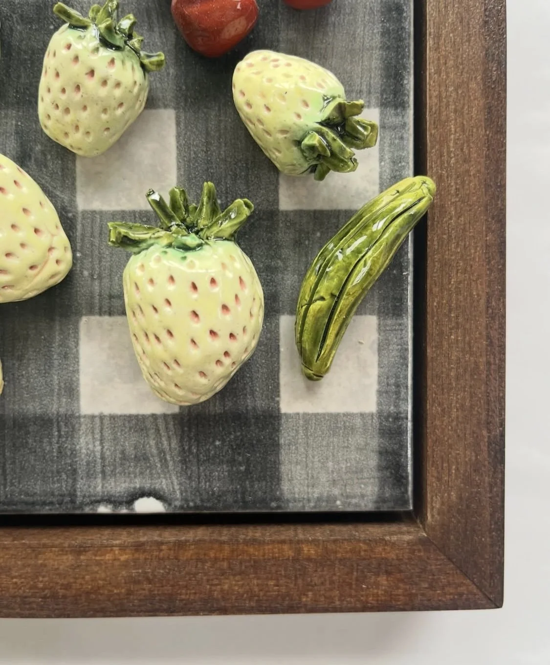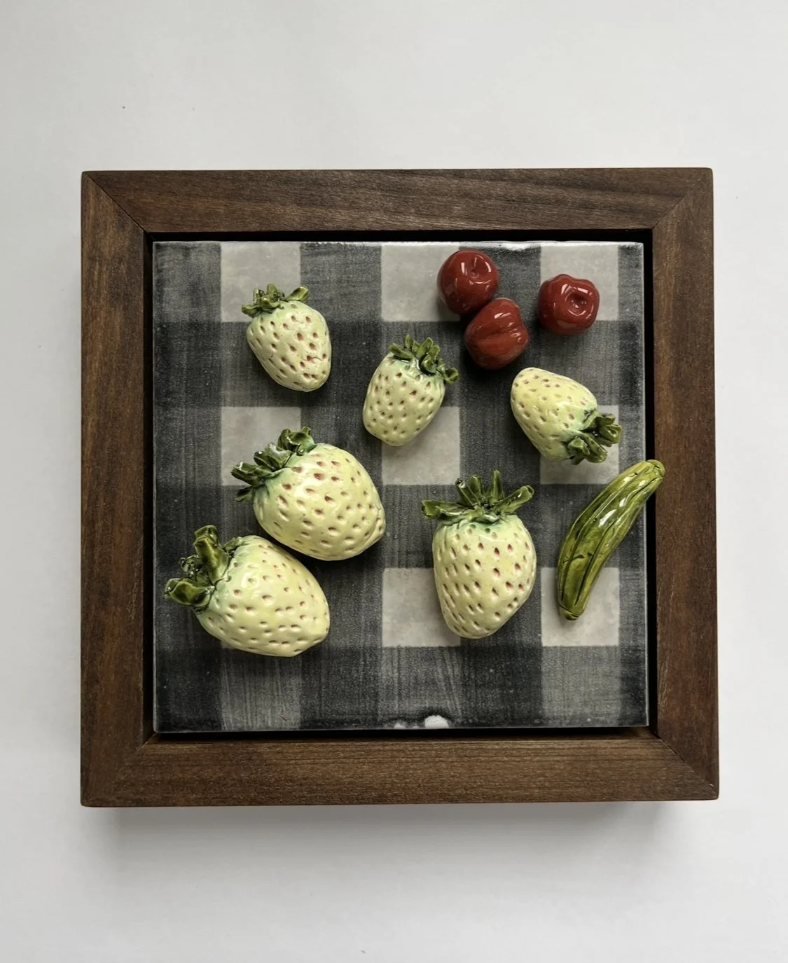 cherries, pineberries and gherkin on black gingham glazed ceramic on porcelain framed in red oak 7.5 x 7.5 in