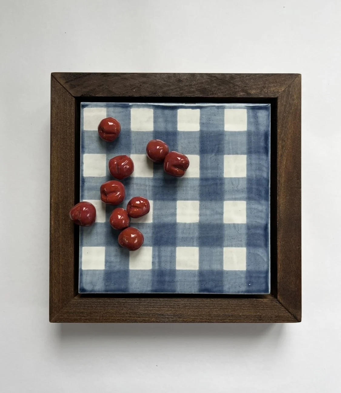cherries on blue gingham glazed ceramic on porcelain framed in red oak 7.5 x 7.5 in