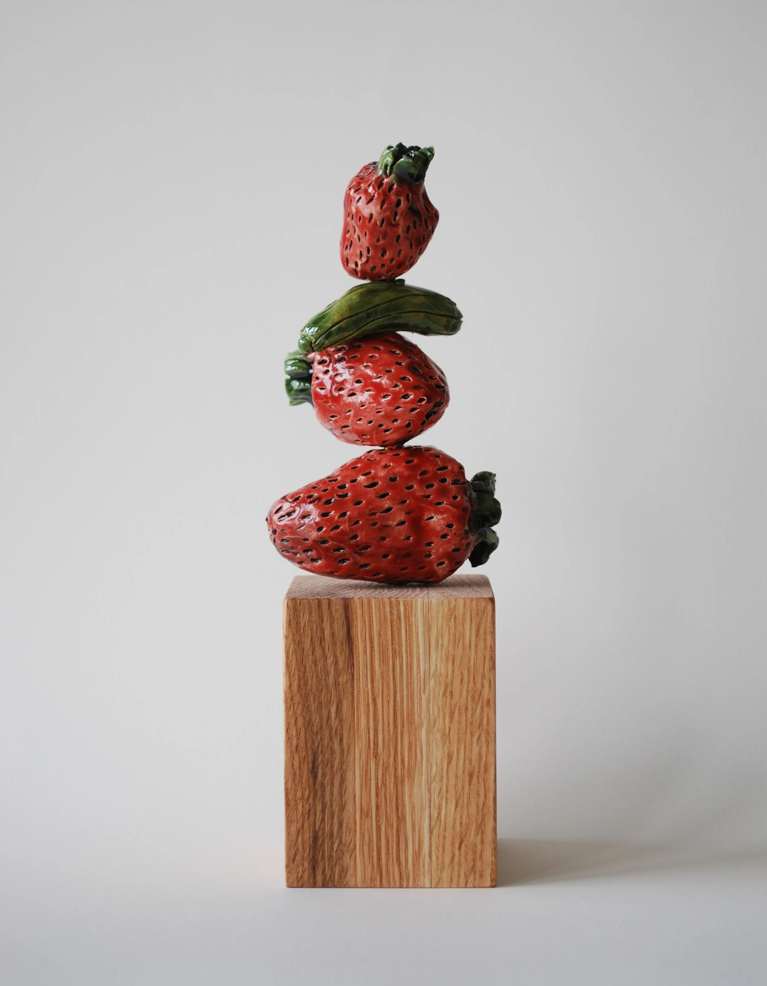 stack of strawberries and gherkin glazed ceramic, brass and wood 3.5 x 2.5 x 2.5 in installation images by ethan hickerson
