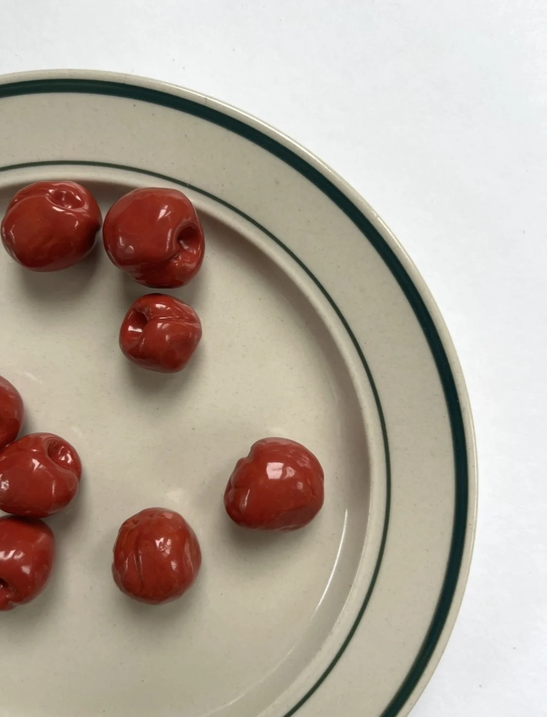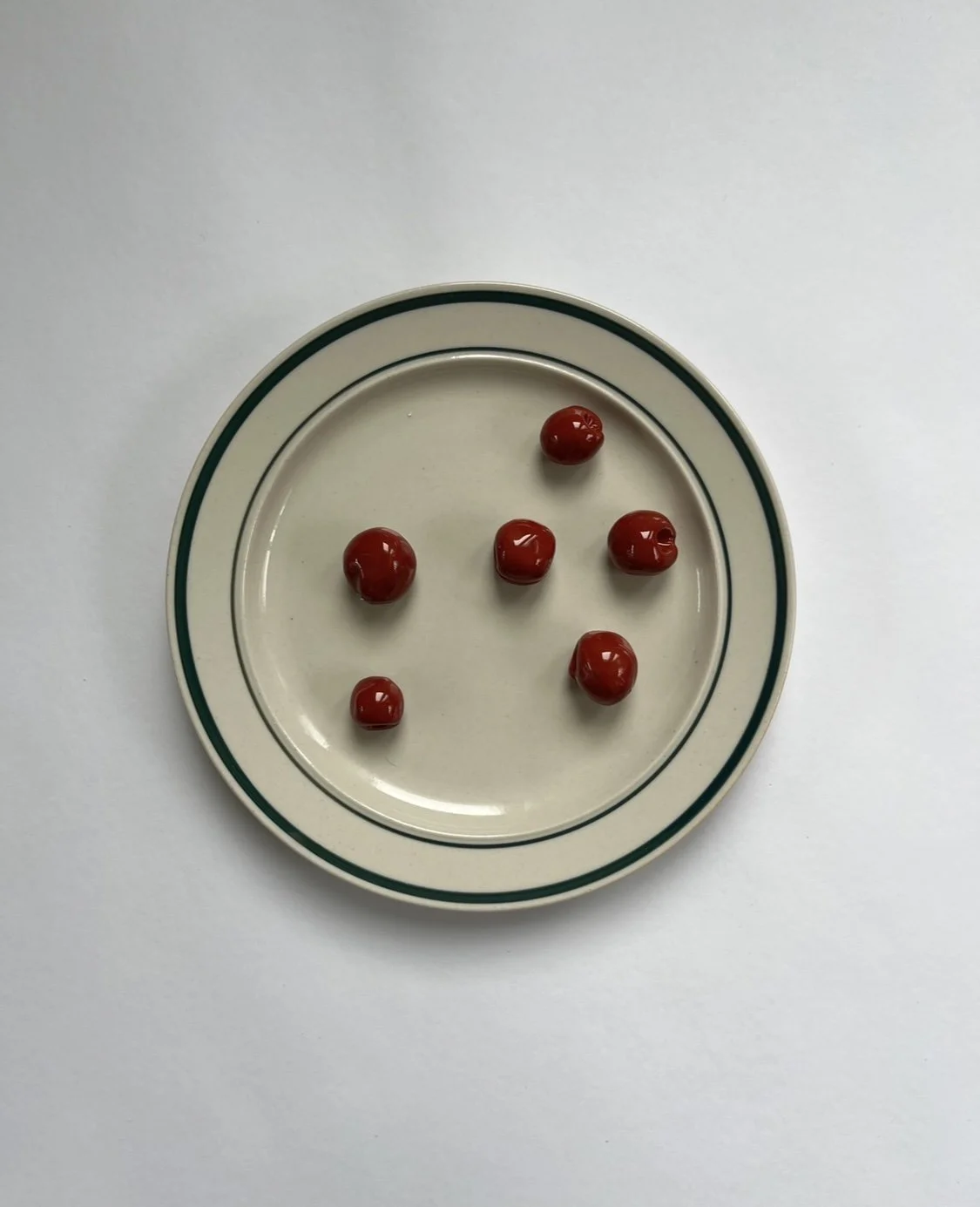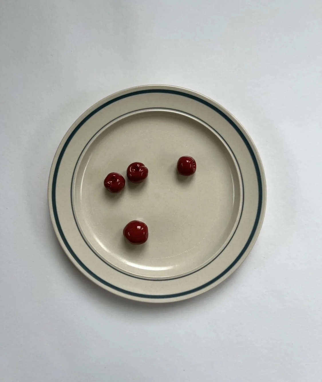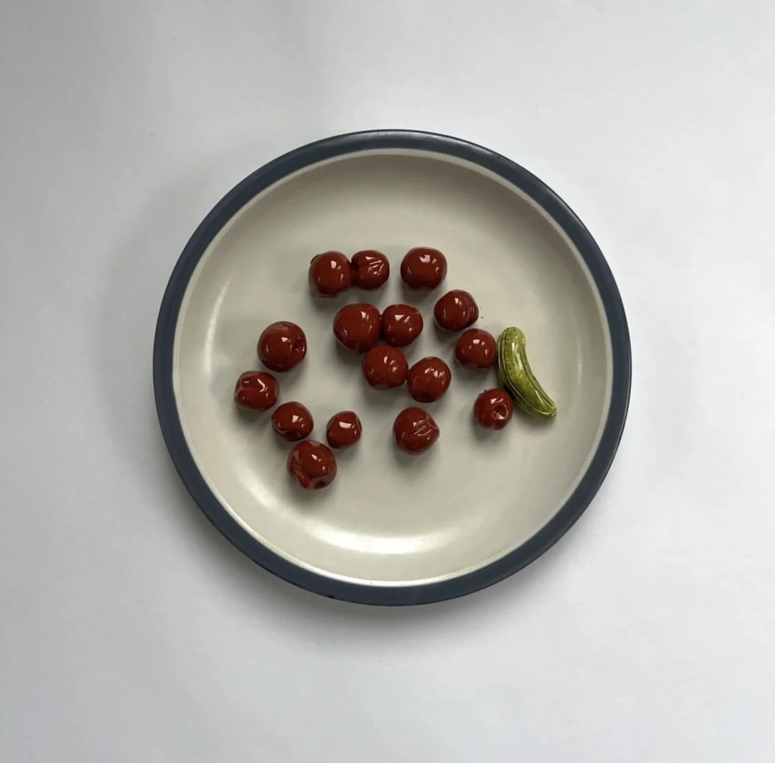cherries and gherkin plate glazed ceramic on found plate 7.5 in diameter