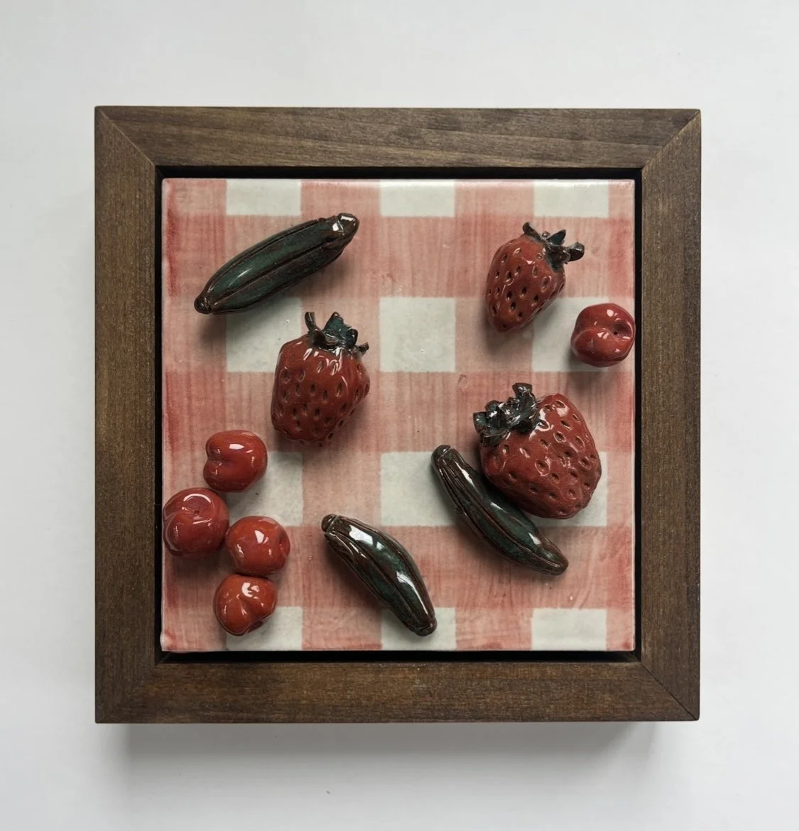 cherries, gherkins and strawberries on red gingham glazed ceramic on porcelain framed in red oak 7.5 x 7.5 in